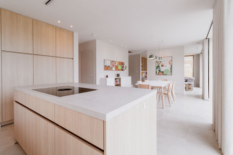 Het interieur is daartegenover heel zacht en warm door het gebruik van hout, wit en beige toetsen. In de leefruimte is er gekozen voor kasten in wit gecombineerd met licht eik. Accenten zoals de trap en scheidingswand tussen de bureauruimte en zithoek zijn voorzien in rubberwood. Op de bovenverdieping zorgt een houten vloer voor karakter en komen de kleuren van het gelijkvloers terug. Alle muren kregen een licht beige tint en dit geeft de woning een warm gevoel.